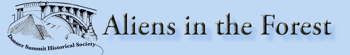 Zeke Borenbroek is renovating the private campground at Cisco Grove. We met with him to talk DSHS, Gould Park (at Cisco), campground plans, and storing 20 Mile Museum signs at the campground in winter to prevent their destruction by snow removal machines. During our conversation Zeke mentioned Aliens in the Forest. We’ve reviewed almost two hundred books at least tangentially related to Donner Summit in the pages of the Heirloom. All the reviews are on our website. In those two hundred or so books we’ve never come across a book about Donner Summit like that and so the search was on for a copy.