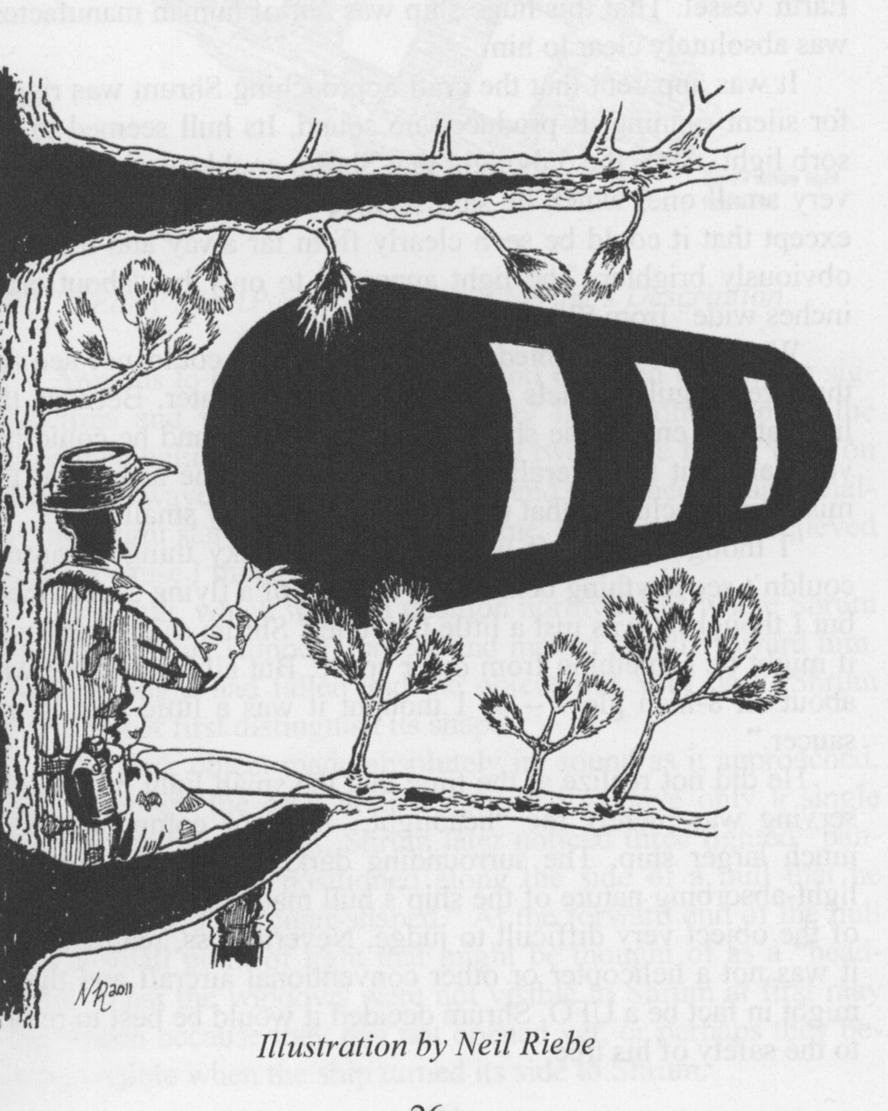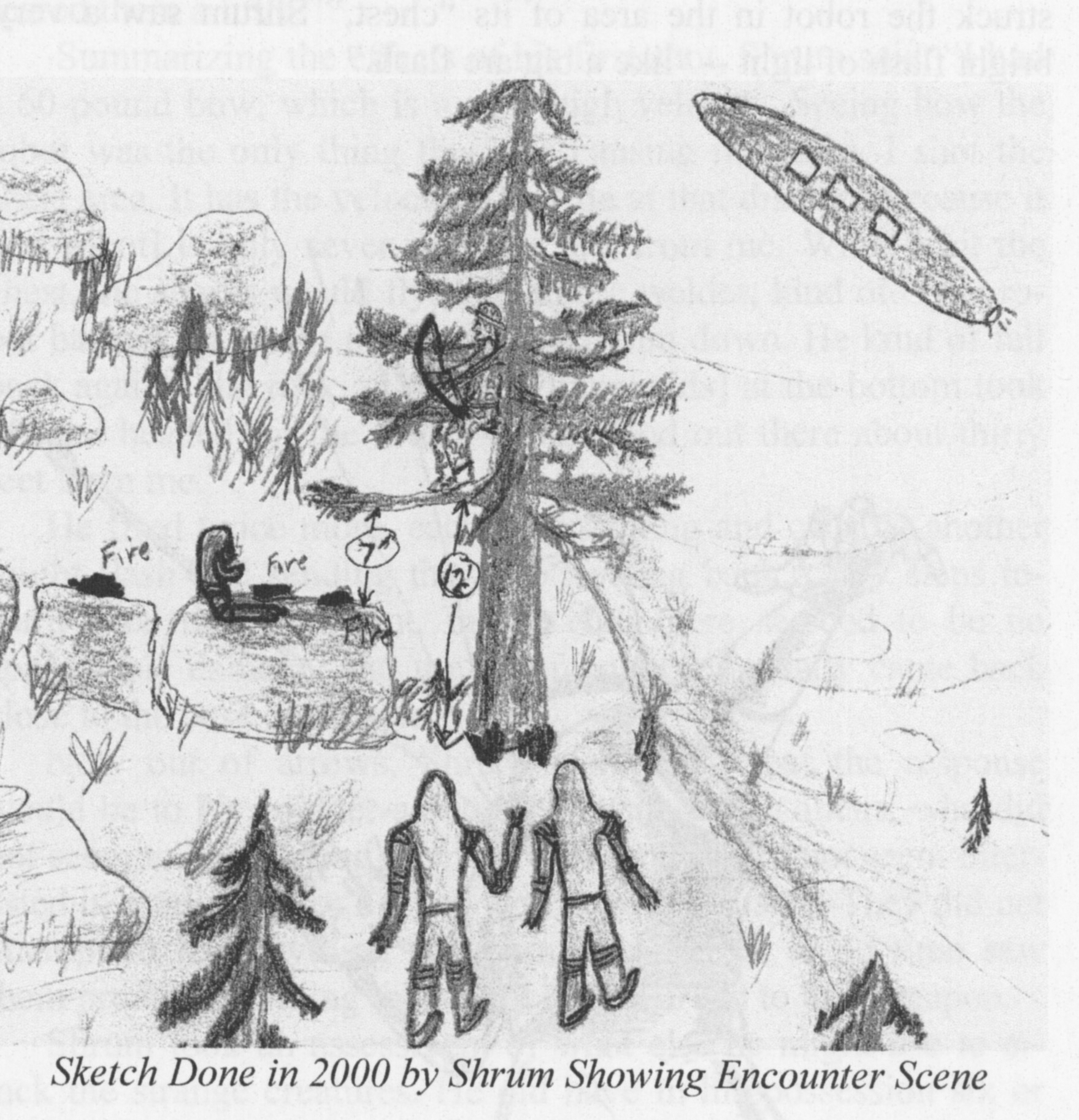 There followed an hours long contest between the aliens and Shrum. The aliens gassed him rendering him unconscious a few times and Shrum fired three arrows at the aliens. The night ended and Shrum found his way back to camp and first one friend and then another. The first friend also saw the light but didn’t have the adventure.