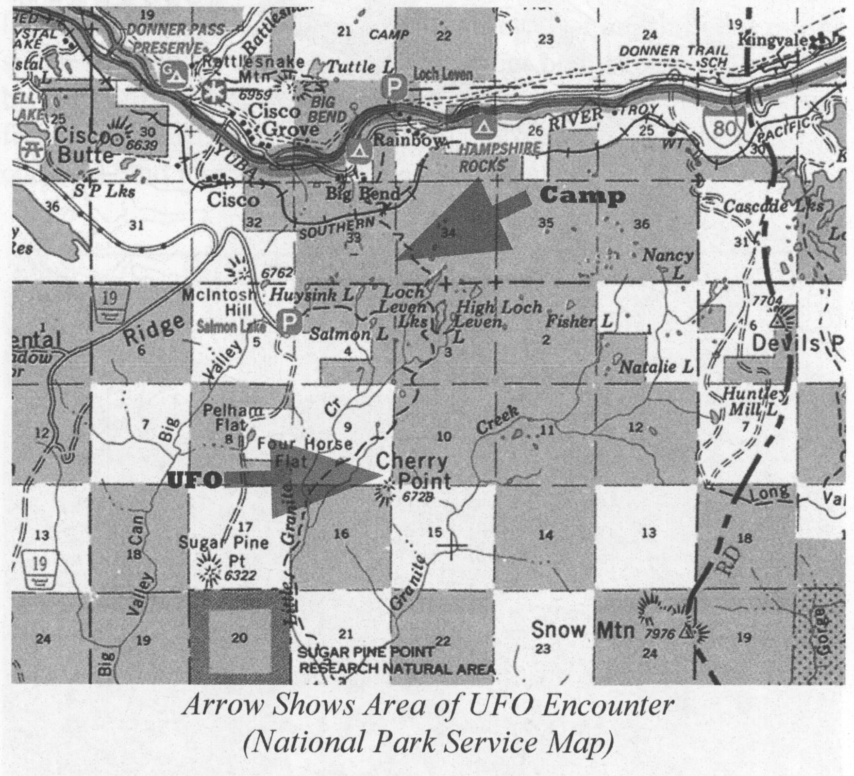 In 1964 Donald Shrum went for a weekend in the wood near Cisco Grove. His experience would haunt him for the rest of his life. That September day Donald and two of his friends went up Highway 40 (there was no I-80 yet) to Big Bend. Just east of Big Bend is the Loch Loch Levin trailhead where they headed into the mountains, set up camp, and went hunting with their bows and arrows. The area south of the lakes is pretty rugged and even though the book says the three men were experienced woodsmen, they all got separated having to spend the night away from their camp, “It was pitched black.”